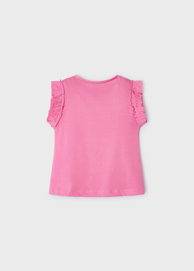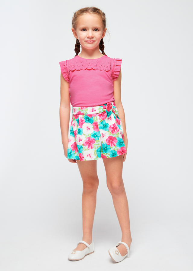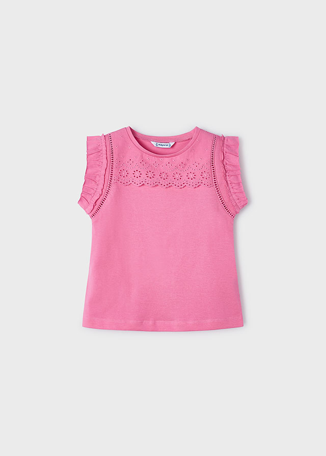 Blusa de manga corta para niña. Diseño con tela hojarota en el pecho. Mangas con diseño perforado y bolero.