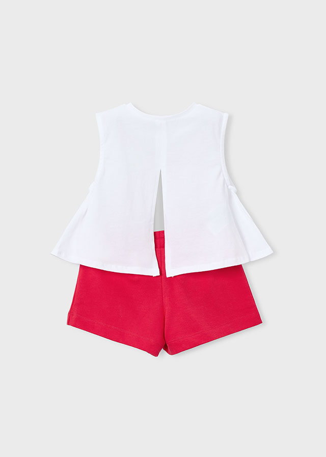 Conjunto para niña. Compuesta por un pantalón corto de color rojo, cintura resortada y una blusa de color blanco sin mangas con estampado delantero.