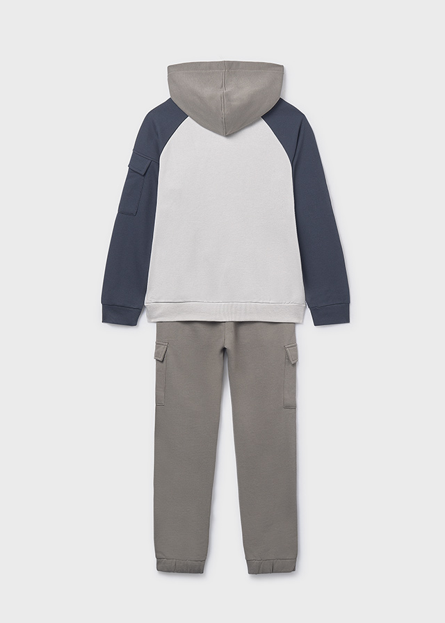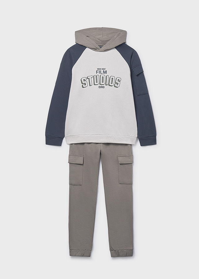 Conjunto de sudadera para chico. Buzo estampado delantero, diseño con mangas y capota a contraste, Bolsillo decorativo con solapa en una manga. tela rib enresortada en los puños y la parte inferior. Pantalón largo tipo sudadera con bolsillos delanteros funcionales y laterales tipo cargo con solapa, resorte en las botas y cordón ajustable en cintura.