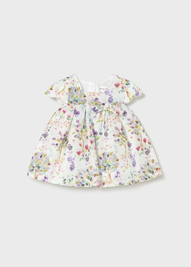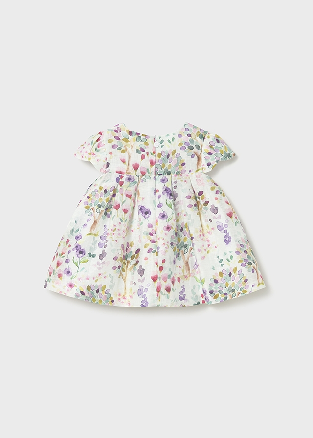 Vestido forrado de manga corta para bebé niña. Estampado de flores, lleva un moñito decorativo en la parte del pecho y cierre de cremallera invisible en la espalda.